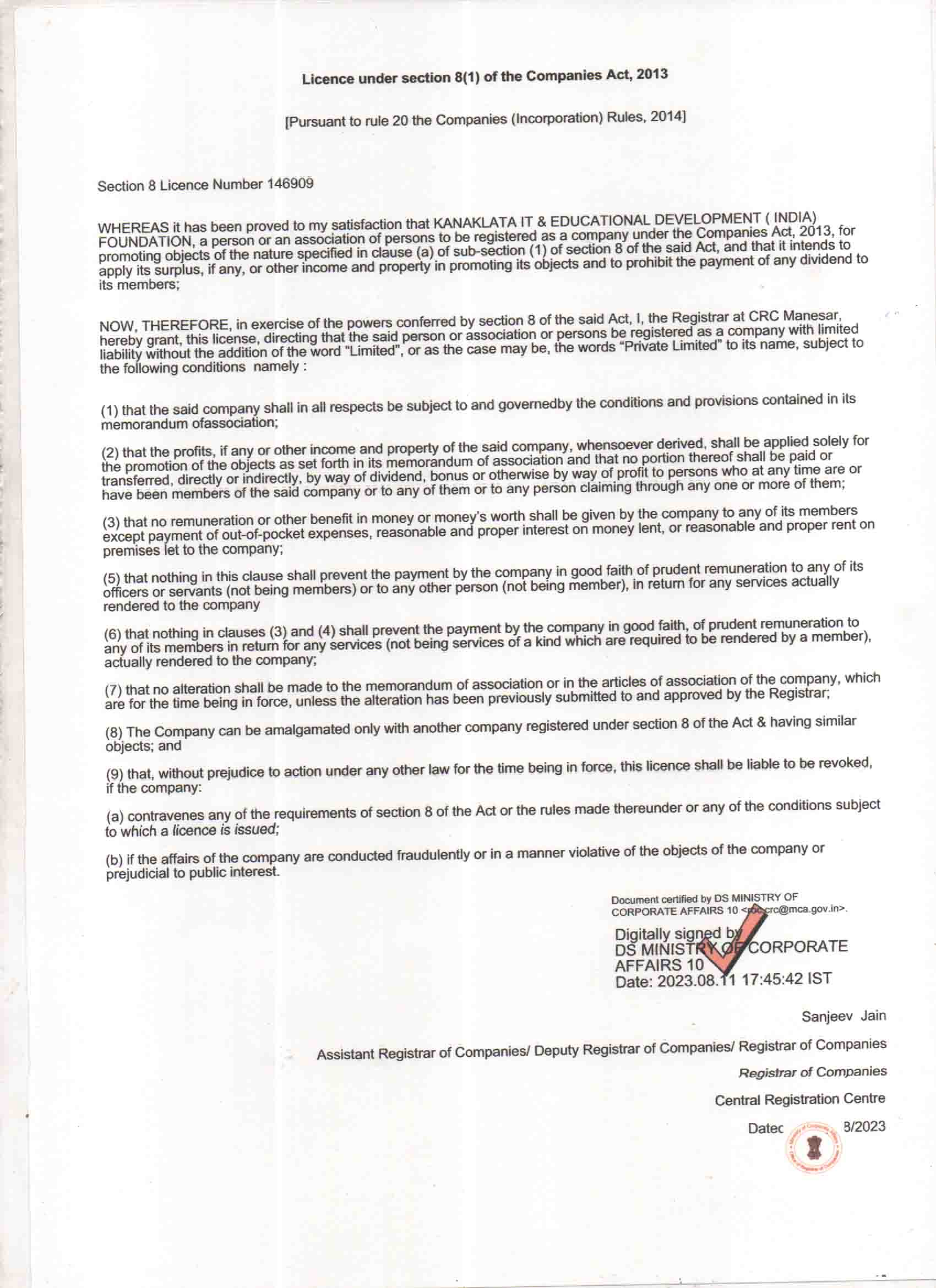 Licence Under Section 8(1) of the Act 2013