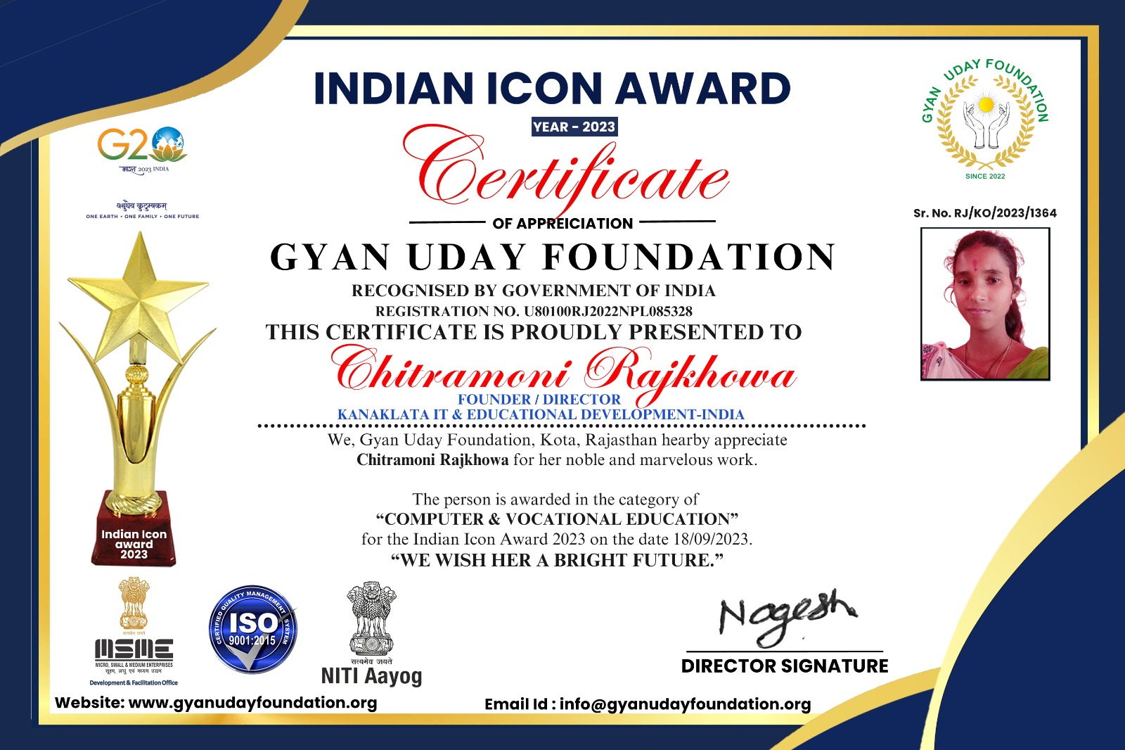 এক সুখৱৰ দেশৰ অন্যতম সৰ্ব ভাৰতীয় সামাজিক প্ৰতিষ্ঠান Gyan Uday Foundation , Kota, Rajasthan য়ে Kanaklata it & Educational Development-India ৰ প্ৰতিষ্ঠাপক সঞ্চালিকা Chitramoni Rajkhowa ক আগবঢ়াইছে Indian Icon Awards 2023